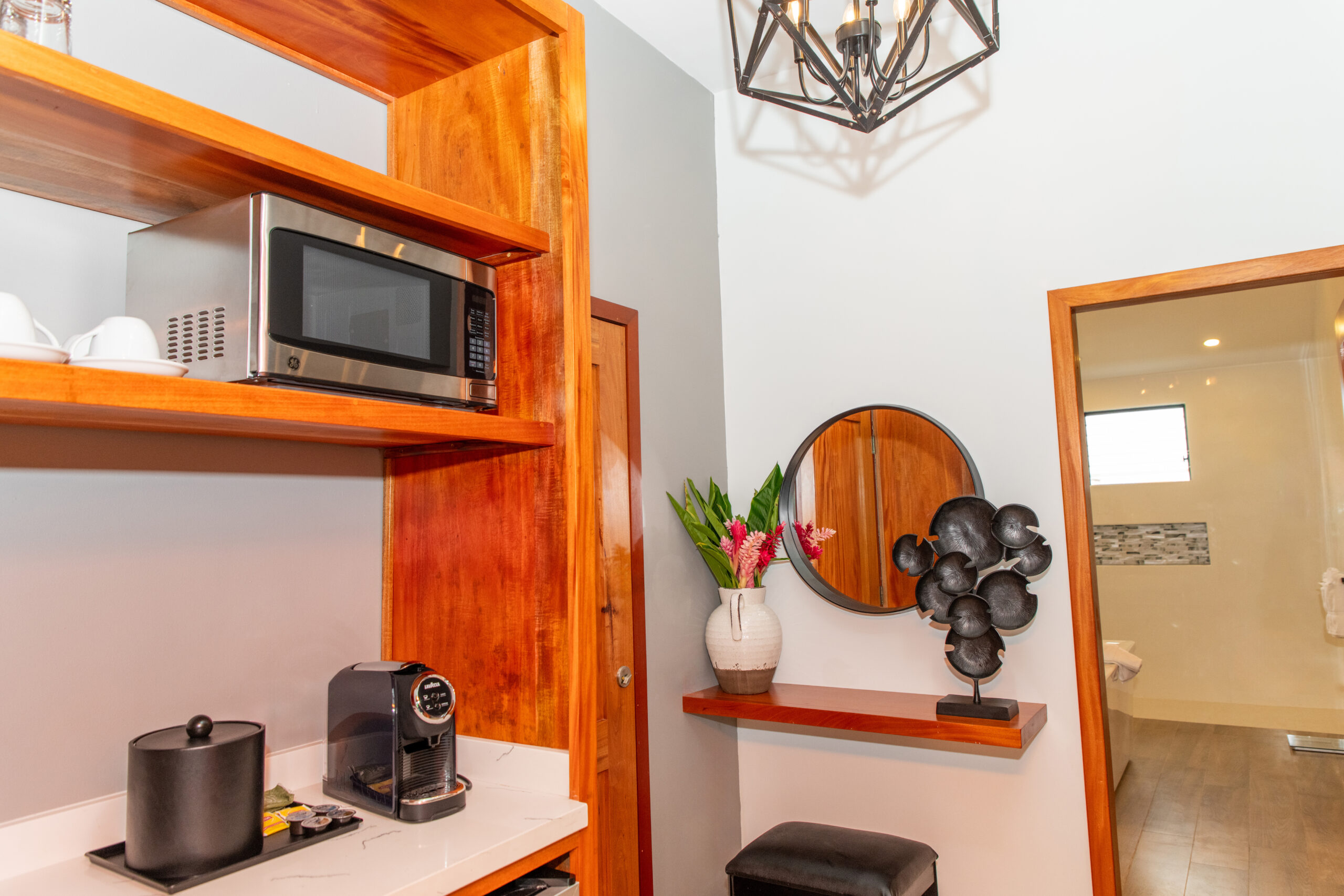 Saftey deposit box, mini refrigerator, microwave, coffee maker, 55″ TV